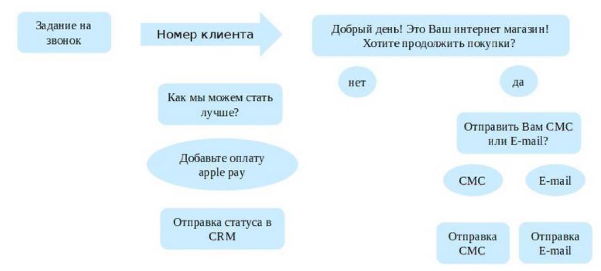 С помощью ПО созданные тексты преобразуются в аудиоформат. Затем система запускает автообзвон по телефонным номерам, загруженным из клиентской базы. В общем виде принцип работы по скрипту выглядит так: